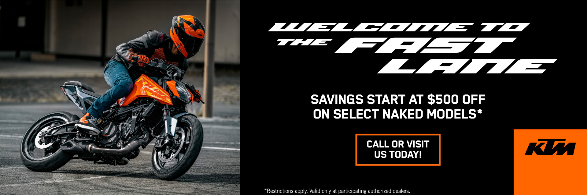 *Terms and Conditions: Offer applies to new, untitled and unregistered 2024 and 2023 KTM offroad (2024: KTM SX-E 3, 5; 50, 50 FACTORY EDITION, 65, 85 (17/14 & 19/16), 125, 250, 300 SX; 250, 350, 450, 450 FACTORY EDITION SX-F; 125, 300 XC; 250, 350, 450 XC-F; 150, 250 XC-W; 450 XCF-W; 350, 500 EXC-F; 500 EXC-F SIX DAYS) and street (2024: KTM 450 SMR; RC 390; 250, 390, 790, 990 DUKE; 1290 SUPER DUKE GT; 690 SMC R; 890 SMT; 690 ENDURO R; 390 ADVENTURE; 890 ADVENTURE R; 1290 SUPER ADVENTURE R; 1290 SUPER ADVENTURE S / 2023: KTM 200 DUKE) model motorcycles. Financing offer available through Santander Consumer Bank “Santander”. Where no money down is indicated, it is available only to those well-qualified applicants with approved credit. Annual Percentage Rates (APR) of 0.99% for up to 60 months, and no down payment offers available to qualified applicants only. Santander requires a minimum financing amount of $1,500. Not all buyers will qualify and if approved may receive a higher rate and higher payment, depending on credit score. Some buyers will require a higher down payment in order to receive credit approval. Other charges may apply. Subject to model availability and dealer participation. Subject to credit approval by Santander, not all applicants will qualify. Santander maintains the right to charge back all costs of financing should a retail promotion and a financing offer be selected when the 2 cannot be combined (as defined in the retail program). Financing offer can change or be cancelled at any time. Offer valid October 20, 2025, through December 31, 2025. This offer cannot be combined with any other offers. Finance offer valid through authorized KTM dealers only. See local authorized dealer for details.